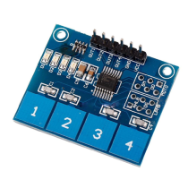 TP224 – TTP224 4-Way Capacitive Touch Switch Module, 2–5.5V DC, with adjustable output modes and onboard LED indicators for touch sensing.
